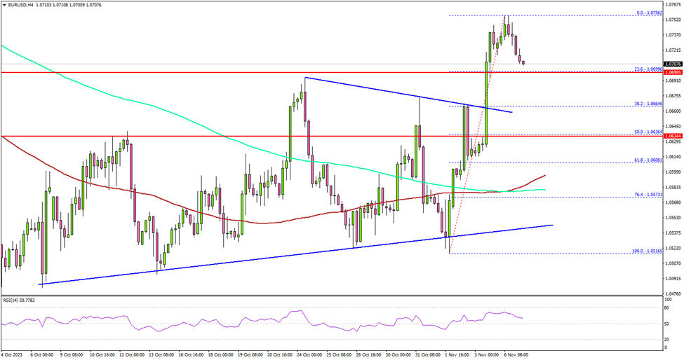4小时图上,该货币对升破一个关键的收敛三角形,阻力接近1.0665。欧元甚至收盘于1.0700上方,这是4小时图100SMA(红色)和200小时MSA均缐(绿色)所在。