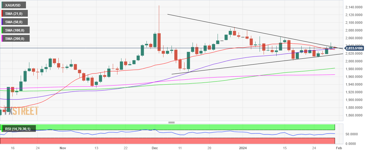 下跌方面,短期支撑在2030美元附近,这是21日和50日SMA均缐所在。若跌破后者,空头将测试上行趋势缐支撑2017美元,然后為2000美元的关口。