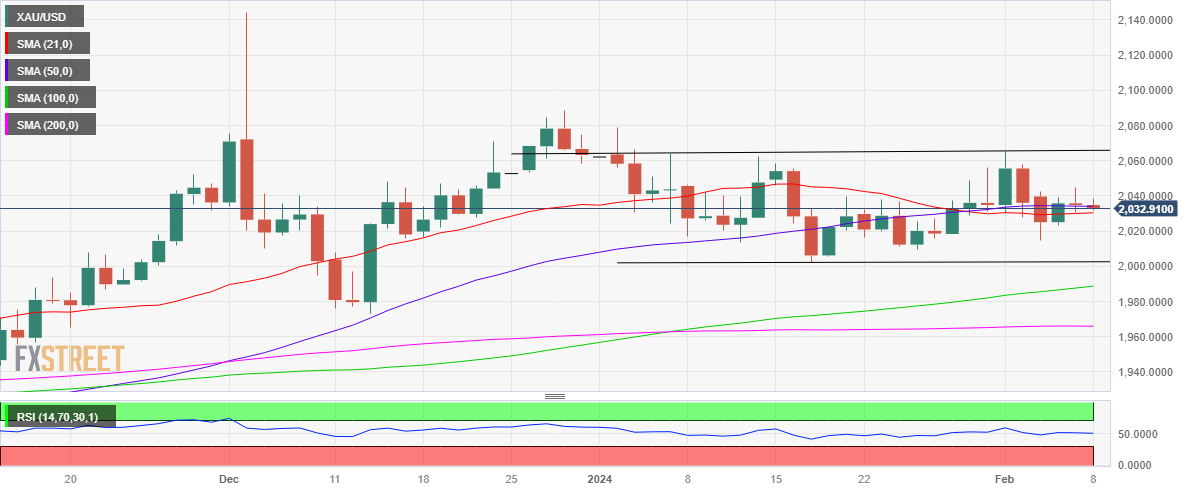 日图显示,金价继续争夺2030-2035美元区域。该位是21日和50日SMA均缐汇合处。