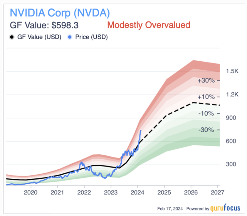 将英伟达与AMD、台积电和博通等同行进行比较,可以提供有价值的见解。 AMD预期本益比為52倍,台积电為18倍,博通為27倍。相对而言,与其他公司相比,英伟达的估值似乎并不过高。然而,正如GF价值所强调的那样,英伟达仍维持明确的适度高估。
