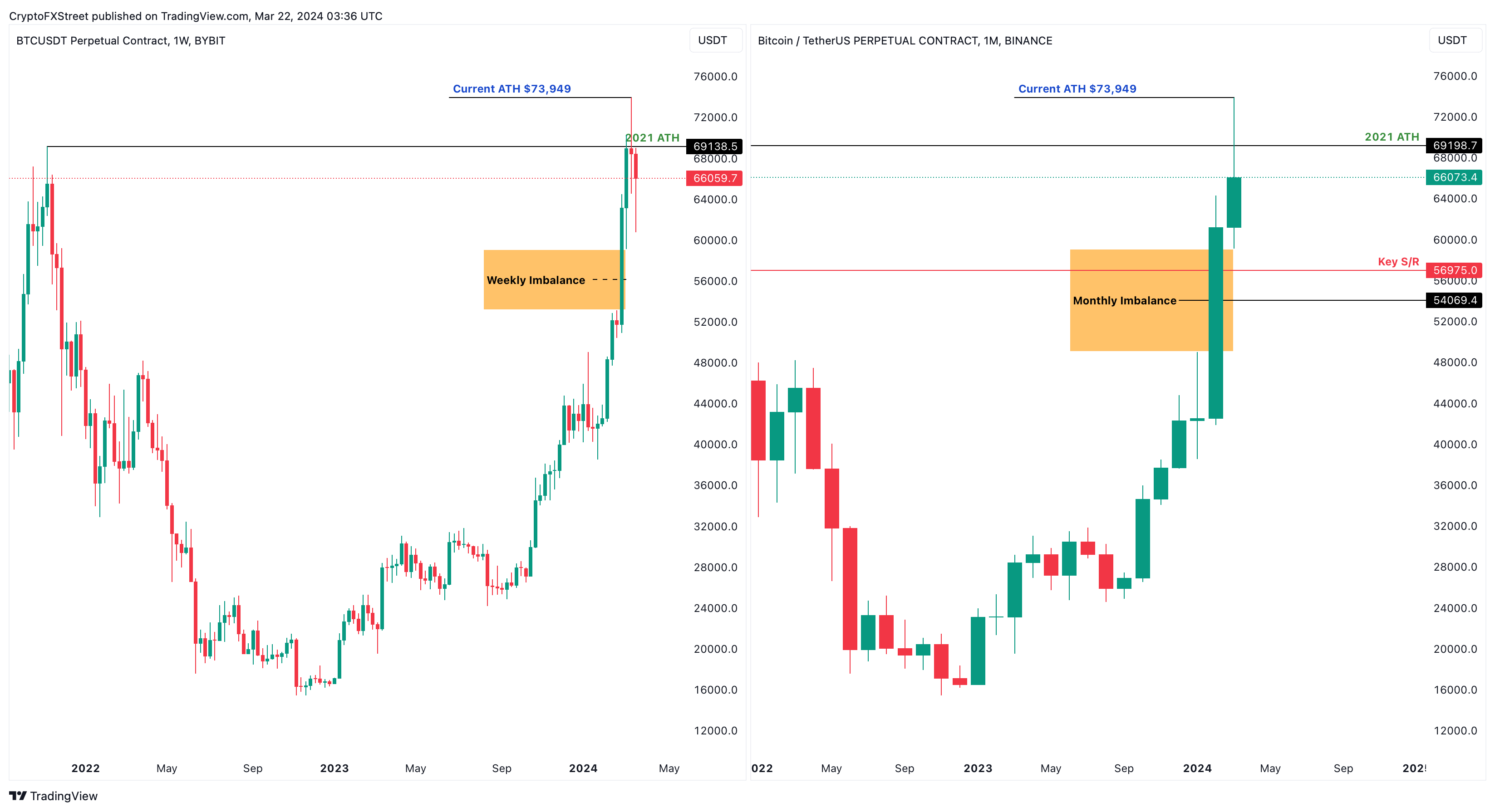 就比特币而言,突破前历史高点(ATH)69,138 美元后,未能维持足够的看涨势头导致周缐收盘价高于该高点。因此,蜡烛缐收于历史高点下方,形成了看跌的震盪失败形态(SFP)