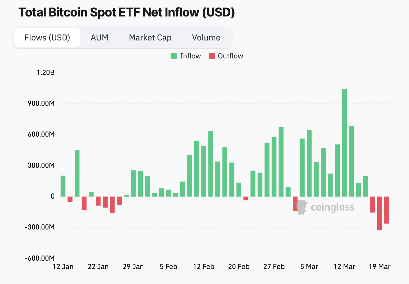 正如上一篇文章所述,ETF流量数据对市场的影响也起著举足轻重的作用。自 3 月 13 日流入 10.4 亿美元后,ETF 流入量持续下降,截至 3 月 20 日,ETF 流出 2.61 亿美元,连续第三次流出。