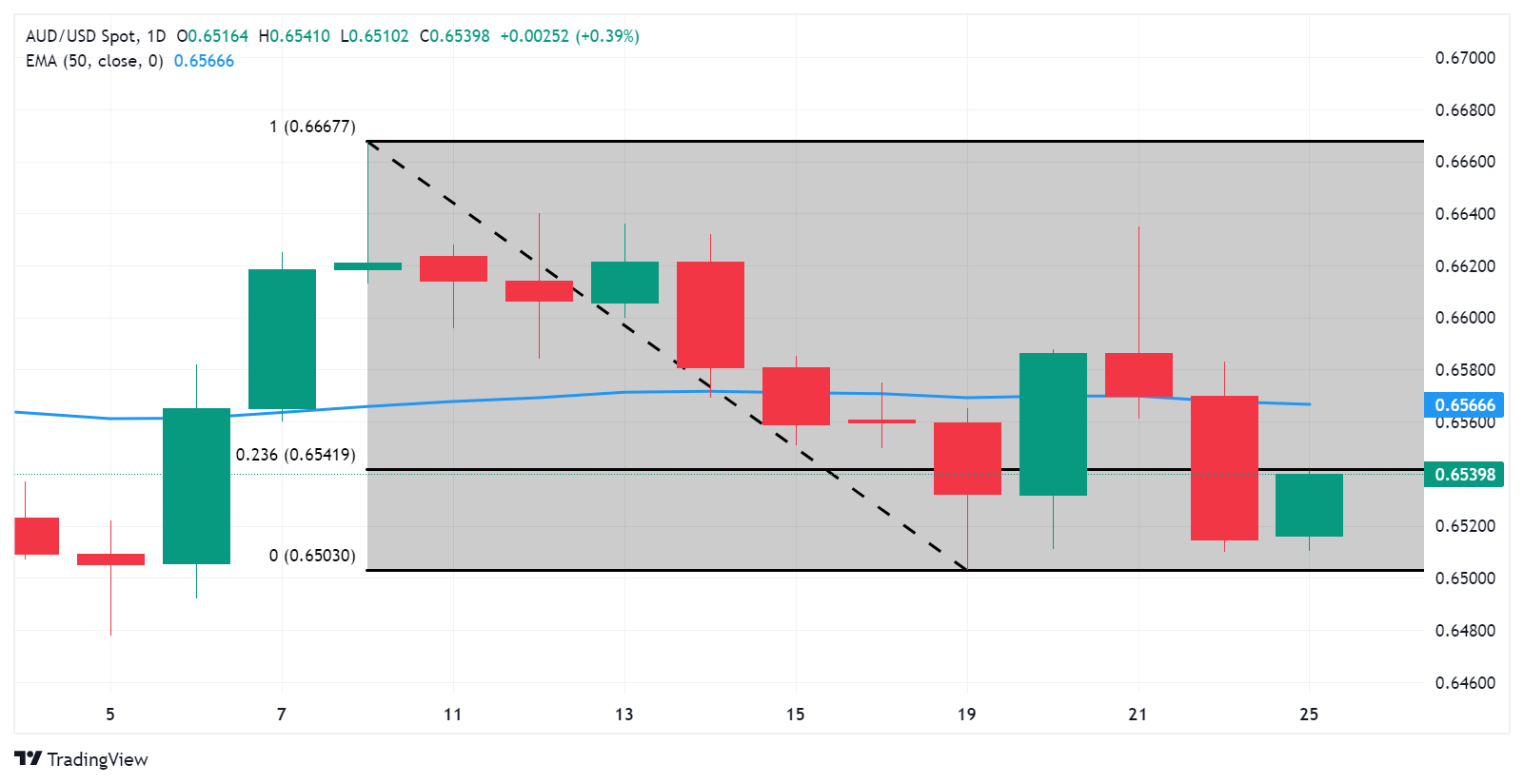 技术分析:澳币徘徊于0.6540下方,然后為23.6%回档位