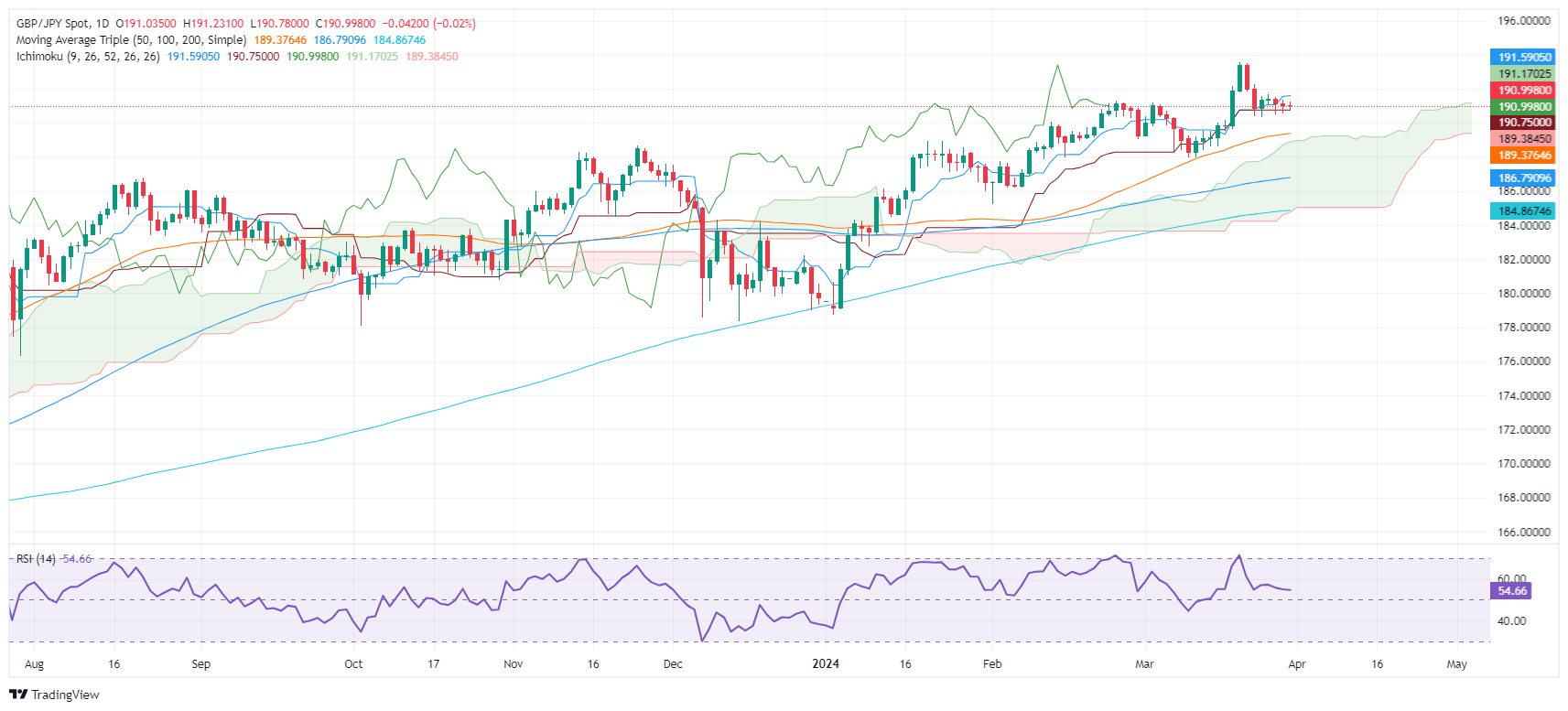 跌破 191.00 可能会為更深的回调铺路。下一个支撑位将是 190.74 点的Kijun Sen,然后是 3 月 25 日的两翼低点 190.33。如果跌破后者,下一个支撑位将是 190.00。