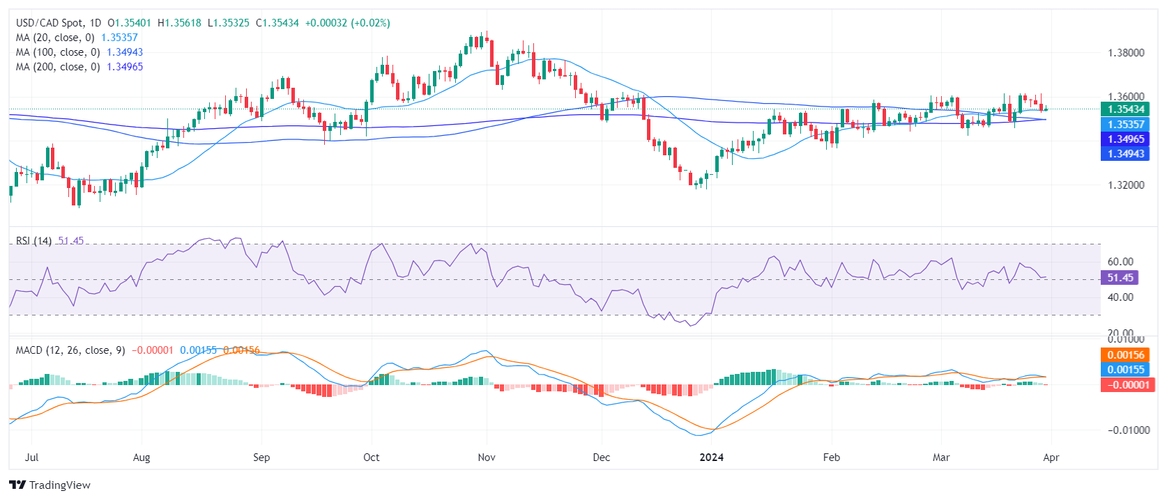 在 日缐图上,美元/加币的走势略显稳定。相对强弱指数(RSI)主要维持在正区域,显示𧹒压略微主导市场。不过,移动平均收敛背离(MACD)柱状图印出了一条新的红柱,这可能意味著看涨势头疲软。