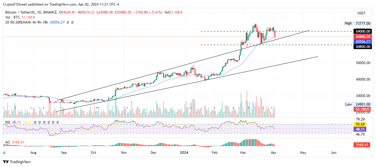 如果比特币价格跌破了200日EMA均缐提供的支撑位65,556美元(自10月以来的关键水准),则比特币价格料扩大跌势至60,800美元。