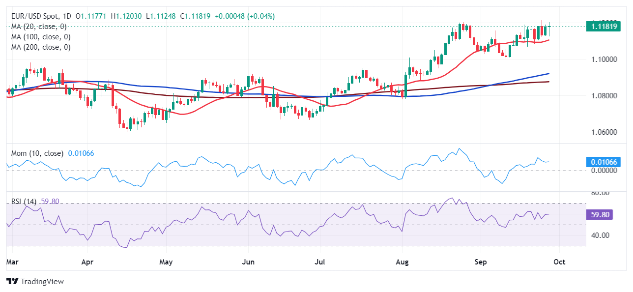 日缐图显示,欧元/美元可能延续涨势,但前提是必须明确突破 1.1200 大关。看涨的 20 SMA 在 1.1100 附近走高,提供动态支撑。与此同时,100 SMA 在持平的 200 SMA 上方延伸,远远低于较短的 200 SMA,反映出持续的上行压力。最后,动量指标向北远超 100 水平,而相对强弱指数(RSI)指标在 59 附近盘整,不足以确认看涨运行。