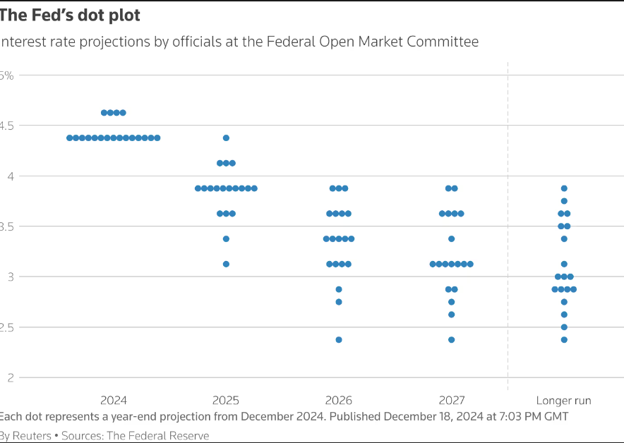 在大西洋彼岸,美联储压倒了英国央行的举动,在 9 月份将联邦基金利率下调 50 个基点至 4.75%-5.00% 的区间,这是美联储四年来的首次降息。9 月大幅降息后,在 2024 年剩余的两次美联储会议中,每次降息 25 个基点,到年底政策利率降至 4.25%-4.50%。美国中央银行在 12 月的政策声明基调中不那麽鸽派的转变促使市场预测明年的降息次数会减少。