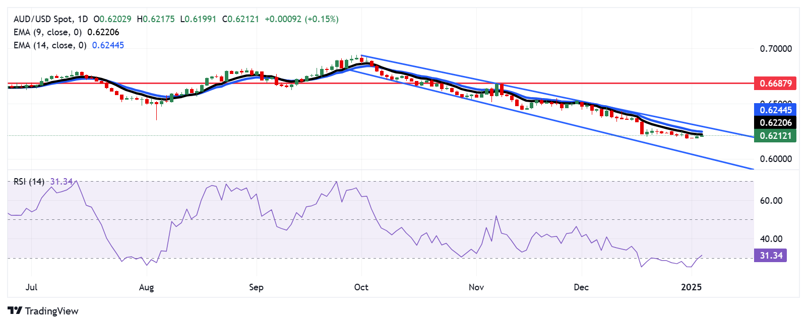 澳元/美元货币对可能在九日指数移动平均缐(EMA)0.6220处遇到即时阻力,下一障碍在14日EMA 0.6244。关键阻力位是下降通道的上边界,约在0.6300的心理关口。
