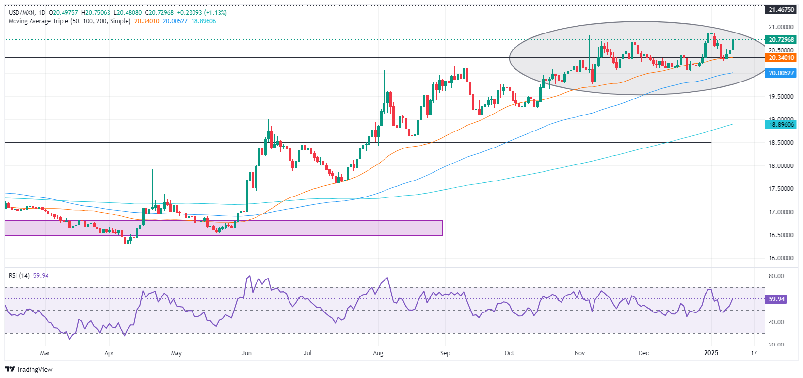 在美国发布出色的就业报告后,墨西哥比索(MXN)对美元(Greenback)承压,跌至六日低点,同时墨西哥央行(Banxico)透露未来会议可能讨论更大幅度的降息。美元/墨西哥比索交易价格為20.70,上涨超过1%。