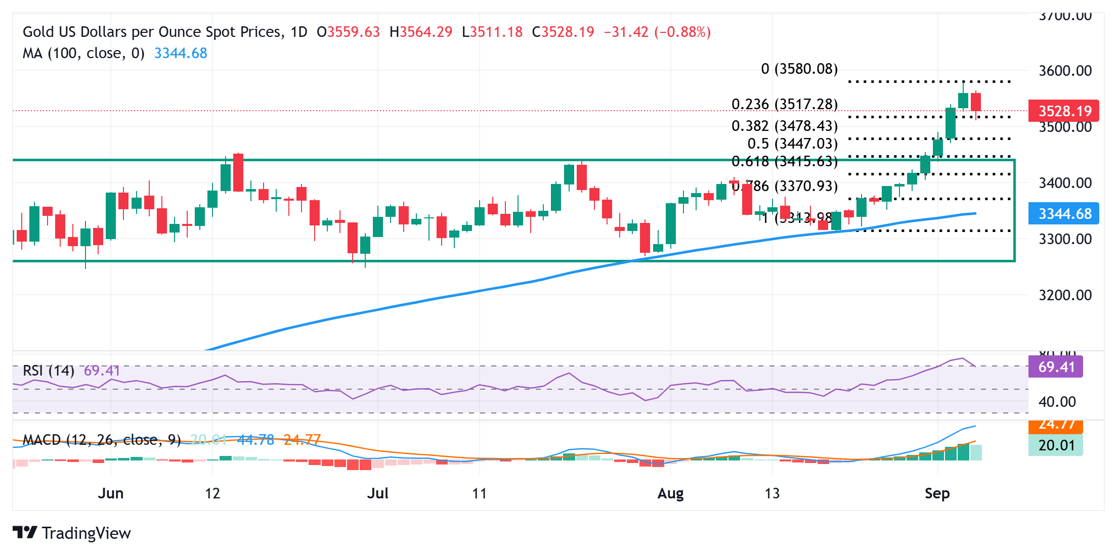 黄金需要在23.6%斐波那契水平和3500美元下方找到接受,以便空头掌控局面
