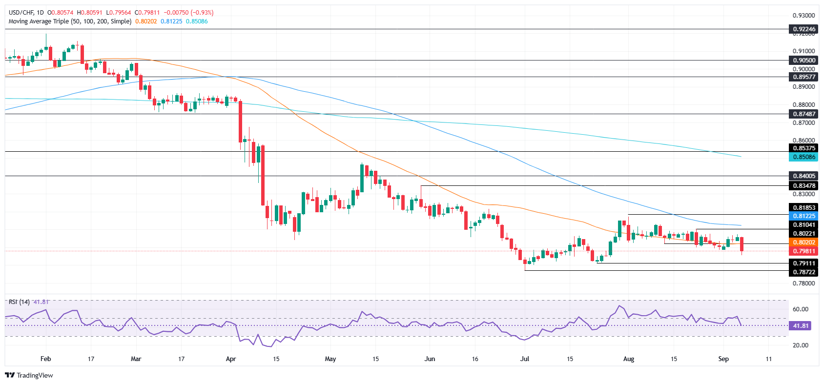 美元/瑞郎在周五延续跌势,跌破0.8020的50日简单移动平均缐(SMA)。美国非农就业报告的表现不及预期,巩固了美联储在9月会议上降息的理由。截止发稿时,该货币对交易于0.7980,跌幅為0.94%。