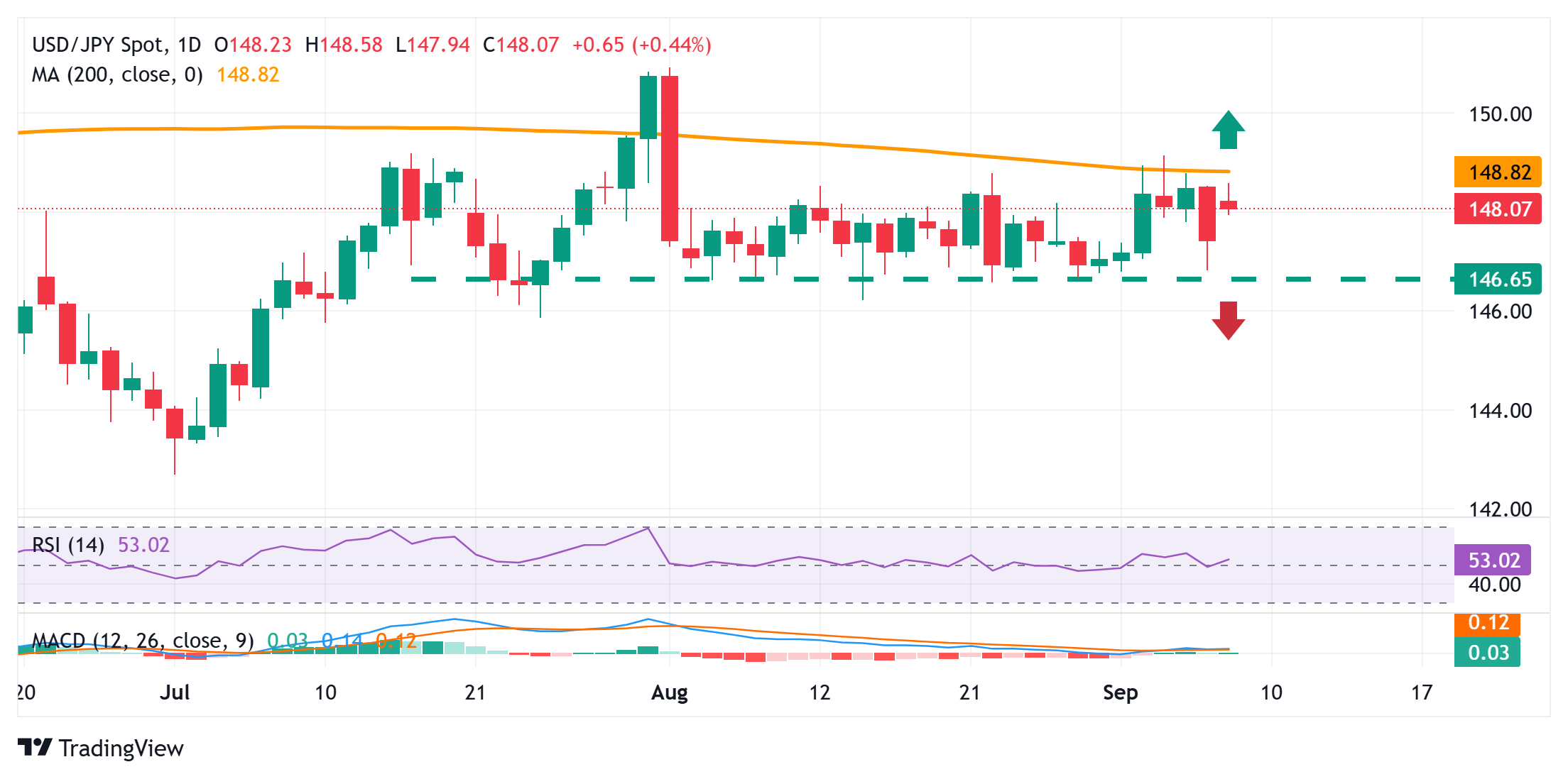 从技术角度来看,日内上涨的走势在非常重要的200日简单移动平均缐(SMA)障碍附近停滞,目前位于148.75区域。这紧随其后的是149.00整数关口和149.20区域,或上周触及的一个月高点。后者代表了从8月高点回落的61.8%斐波那契回撤水平,如果能够果断突破,将被视為美元/日圆多头的新触发点。现货价格可能会瞄准重新夺回150.00心理关口,并进一步延续动能,挑𢧐8月份的月度高点,约在151.00附近。