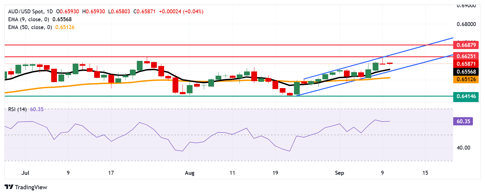 AUD/USD货币对在周三交易约為0.6580。日缐图的技术分析显示,该货币对仍在上升通道模式内,表明持续的看涨偏向。此外,该货币对位于九日指数移动平均缐(EMA)之上,表明短期价格动能较强。