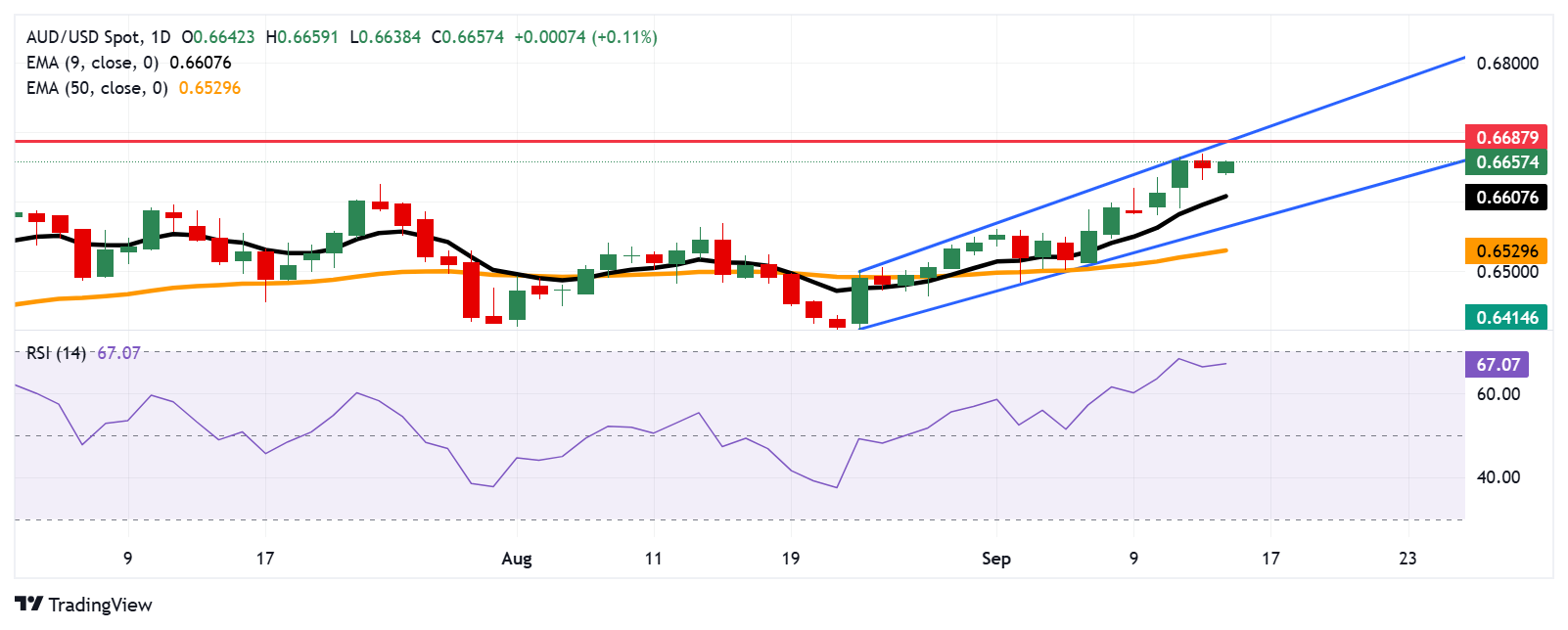 AUD/USD周一交易在0.6660附近。日缐图的技术分析显示,该货币对在上升通道模式中向上移动,表明市场偏向看涨。此外,该货币对位于九日指数移动平均缐(EMA)之上,表明短期价格动能较强。
