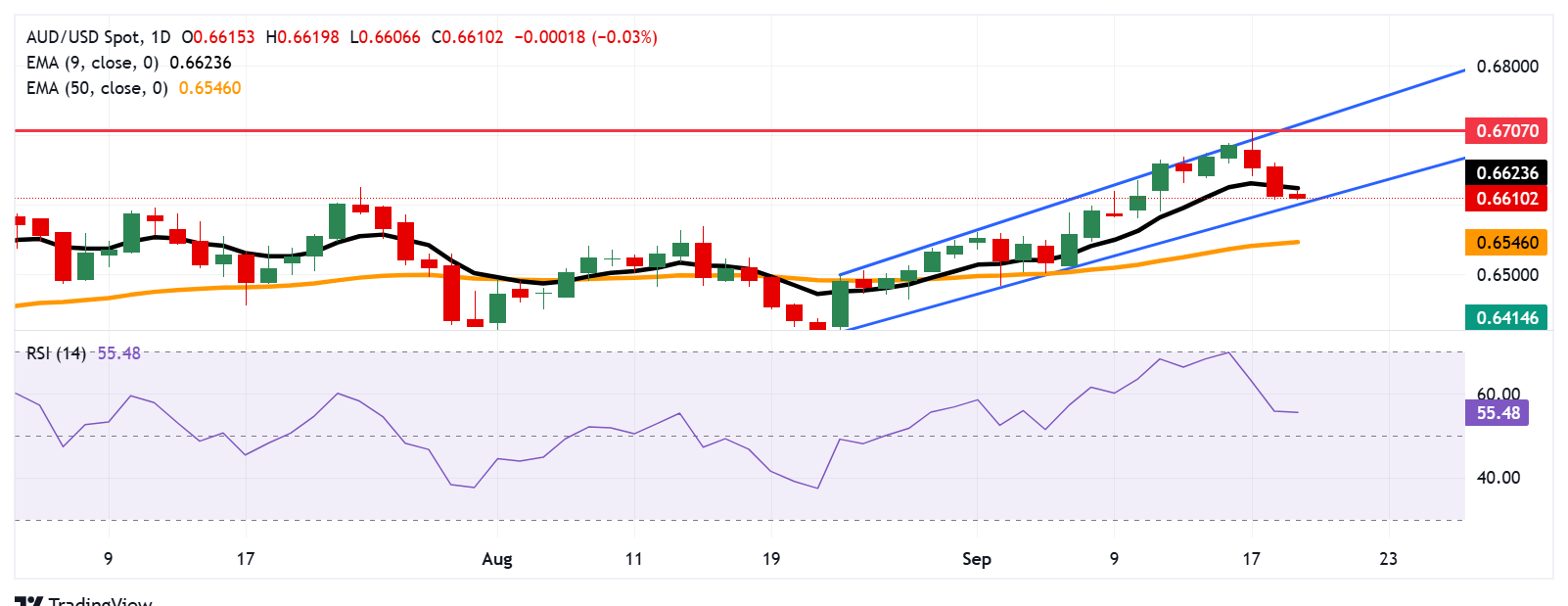 AUD/USD货币对周五交易价格约為0.6610。日缐图的技术分析表明,该货币对仍在一个上升通道内,增强了看涨偏向。然而,短期价格动能转弱,价格跌破了九日指数移动平均缐(EMA)。