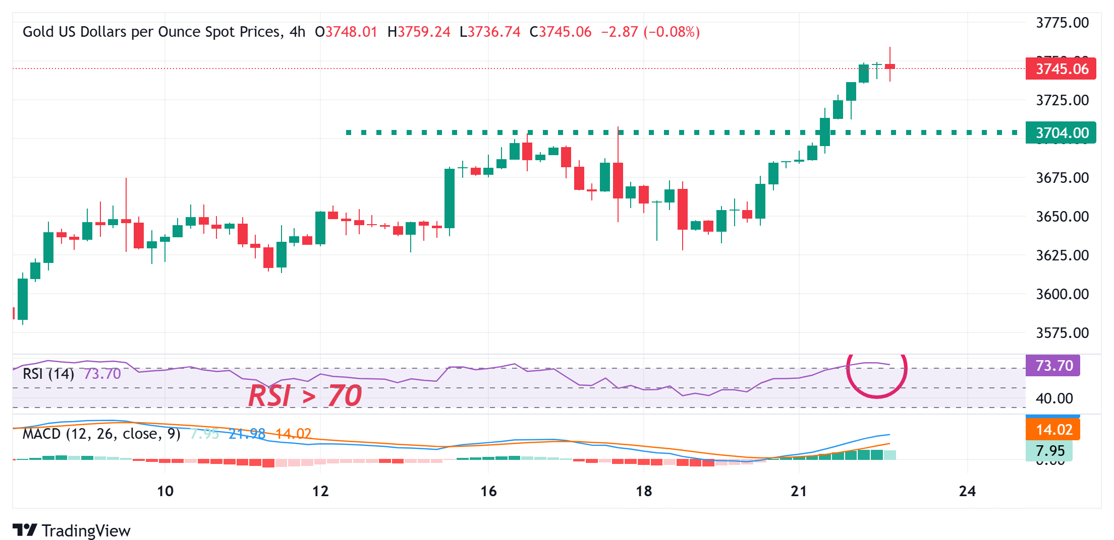 从技术角度来看,夜间突破并收于$3,700以上的水平可视為多头交易者的新触发点。此外,近期的上涨未受到日缐图上超𧹒相对强弱指数(RSI)的影响。这反过来支持黄金价格在短期内进一步升值的可能性,暗示任何修正性下滑都可视為𧹒入机会。
