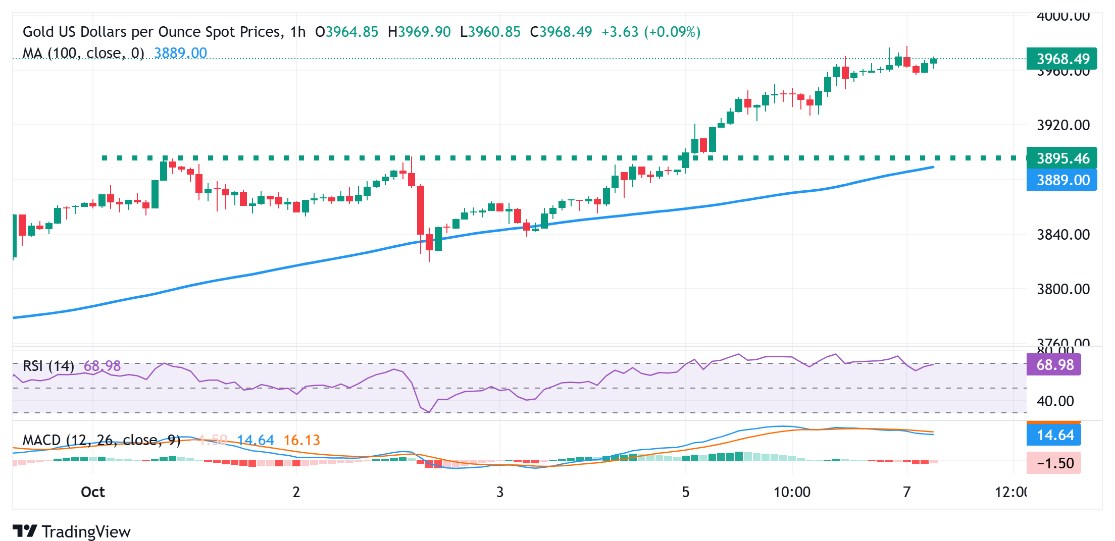 突破3900美元的夜间突破被视為多头的新触发点,并支持黄金价格延续最近确立的上升趋势。然而,日缐图上的相对强弱指数(RSI)保持在70以上,指向极度超𧹒的状态。这使得在进一步上涨之前,等待一些短期整合或适度回调是明智的。