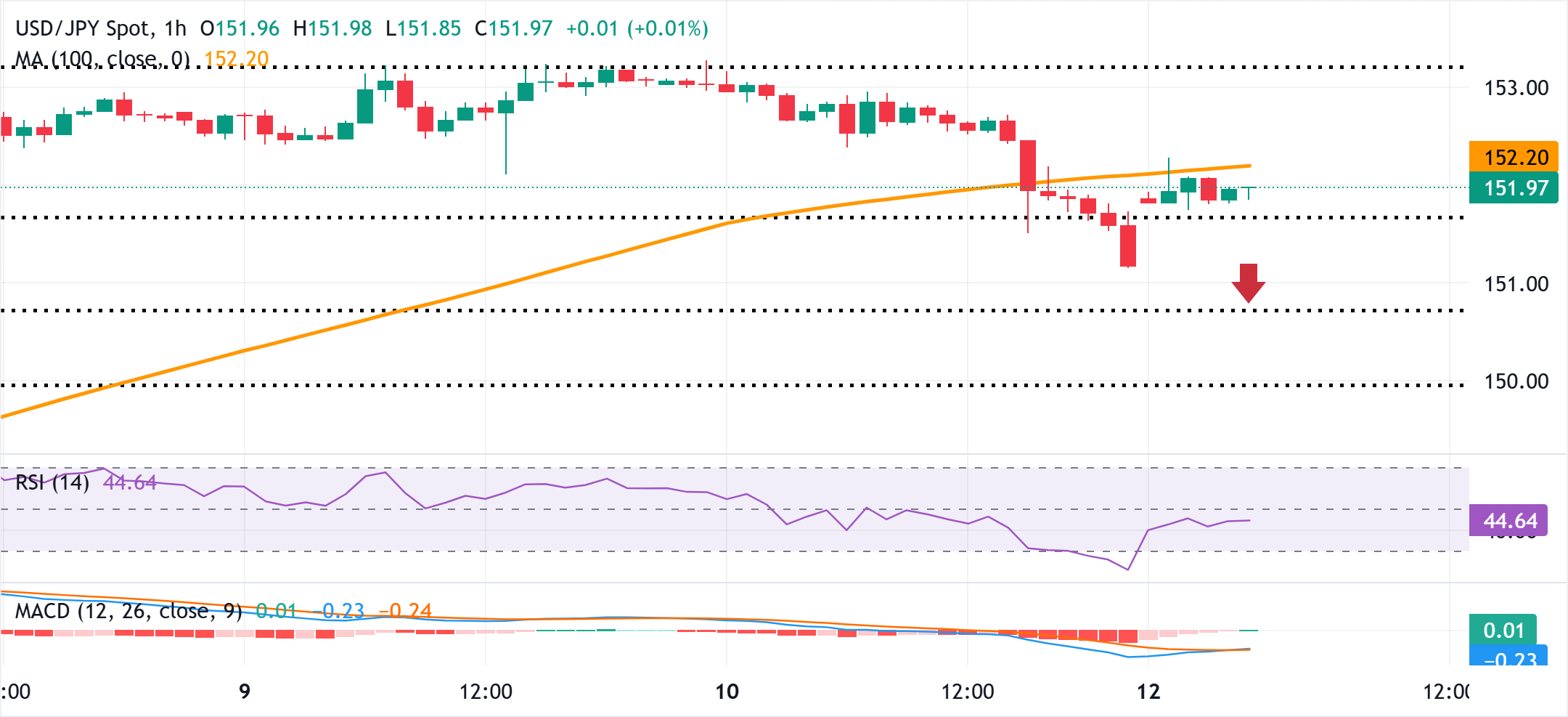 美元/日圆在152.00附近低于100小时均缐时似乎脆弱