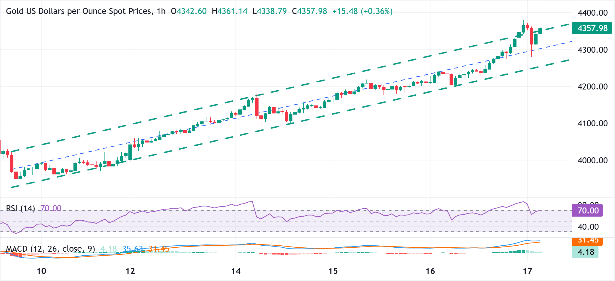 日相对强弱指数(RSI)仍远高于70。这可能促使XAU/USD的多头从市场上获利了结,并引发急剧回调。然而,任何跌破4300美元的修正性下跌可能仍会在亚洲时段低点附近找到一些支撑,约在4280-4279美元区域。然而,后续的抛售可能会将黄金价格拖向4235-4230美元区域,途经夜低点,约在4200美元附近。后者应作為一个关键的转折点,如果被果断突破,可能会為更深的损失铺平道路。