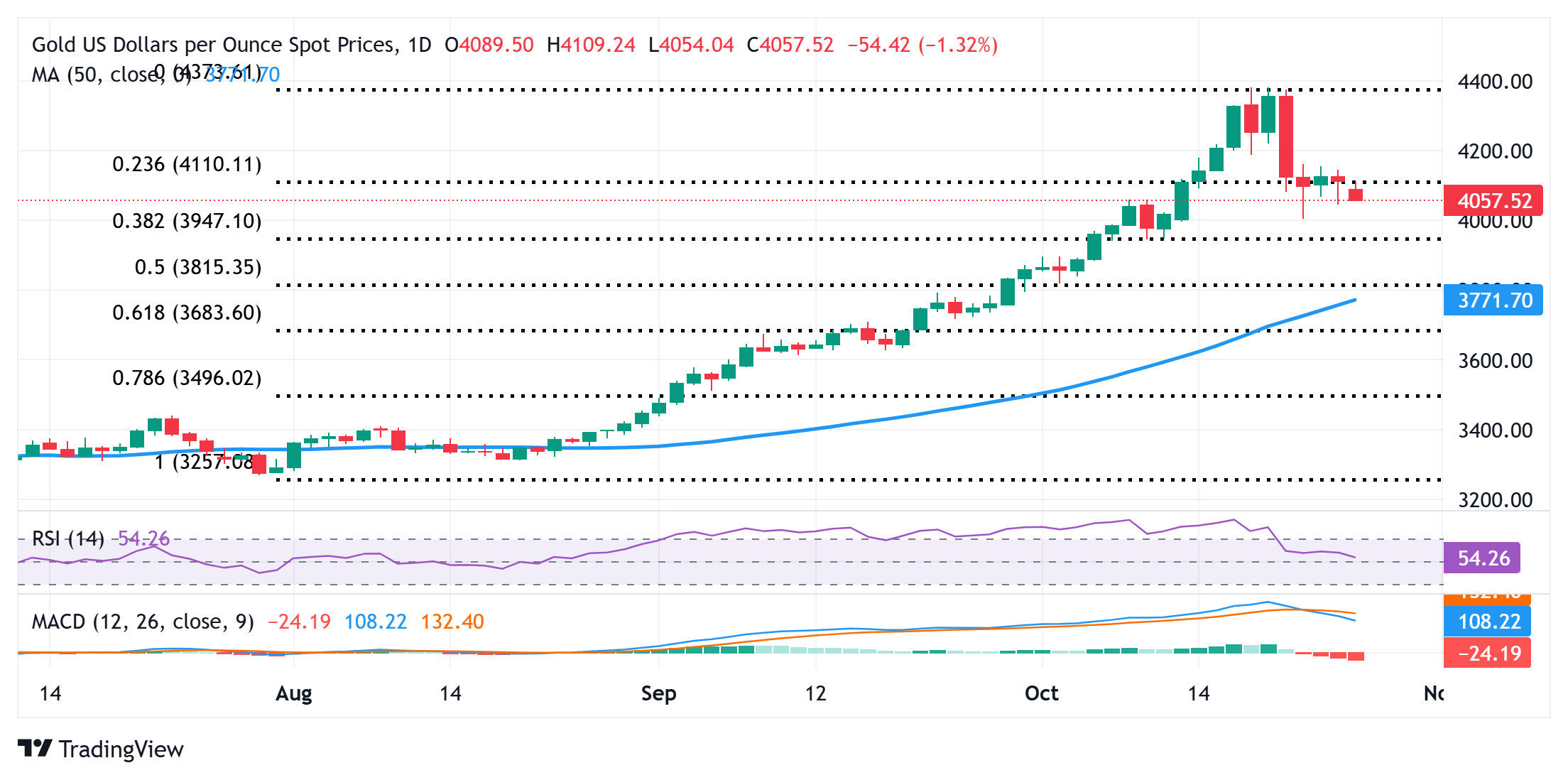 从技术角度来看,该商品现在似乎已经在7月至10月的暴涨回调的23.6%斐波那契回撤位下方找到了支撑。然而,上周从4000美元心理关口附近的反弹以及日缐图上的混合振盪指标使得XAU/USD的空头需保持谨慎。这反过来表明,任何后续跌破周五的波动低点(约4044美元区域)可能会继续吸引一些𧹒家靠近该水平。接下来是38.2%斐波那契回撤位,约在3948美元区域,如果被果断突破,可能会将黄金价格拖至3900美元以下。一些后续卖盘应為价格向50%回撤位(约3810-3800美元区域)下跌铺平道路,途径50日简单移动平均缐(SMA),目前位于3775美元附近。
