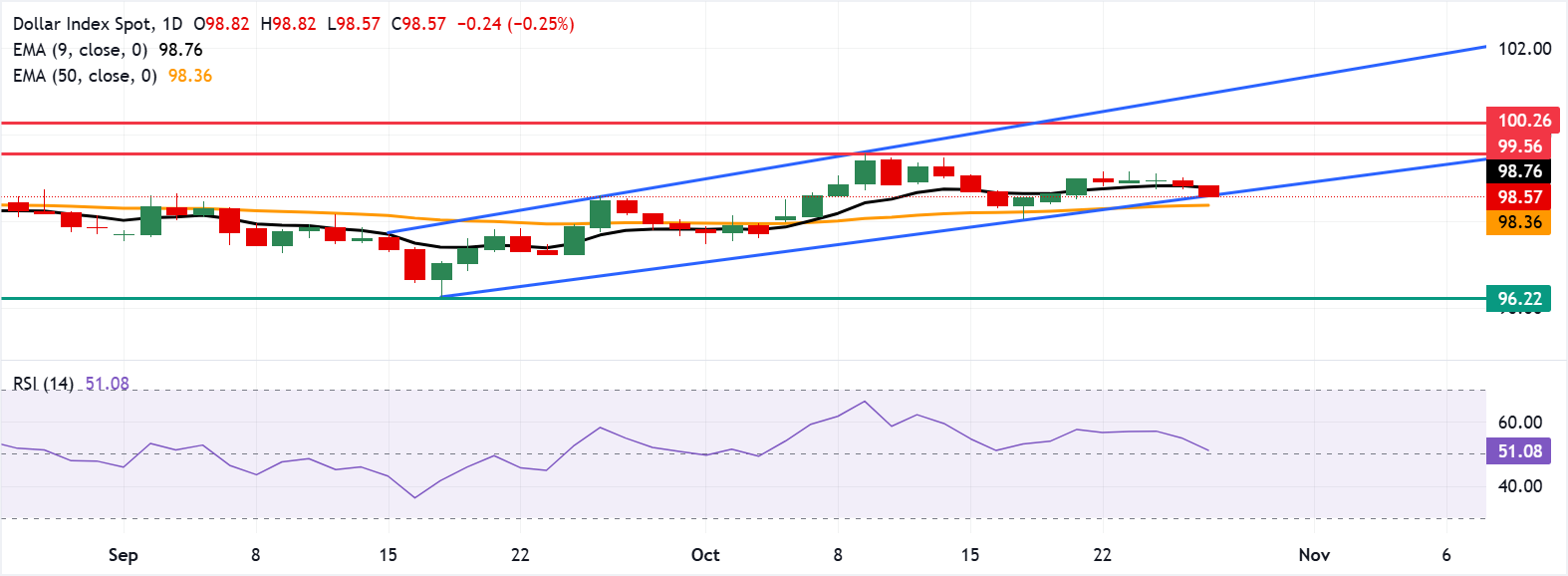 美元指数(DXY)衡量美元(USD)相对于六种主要货币的价值,连续第二天延续跌势,周二亚洲时段交易在98.60附近。日缐图的技术分析显示,美元指数正在测试上升通道模式的下边界,暗示动能可能从看涨转向看跌。