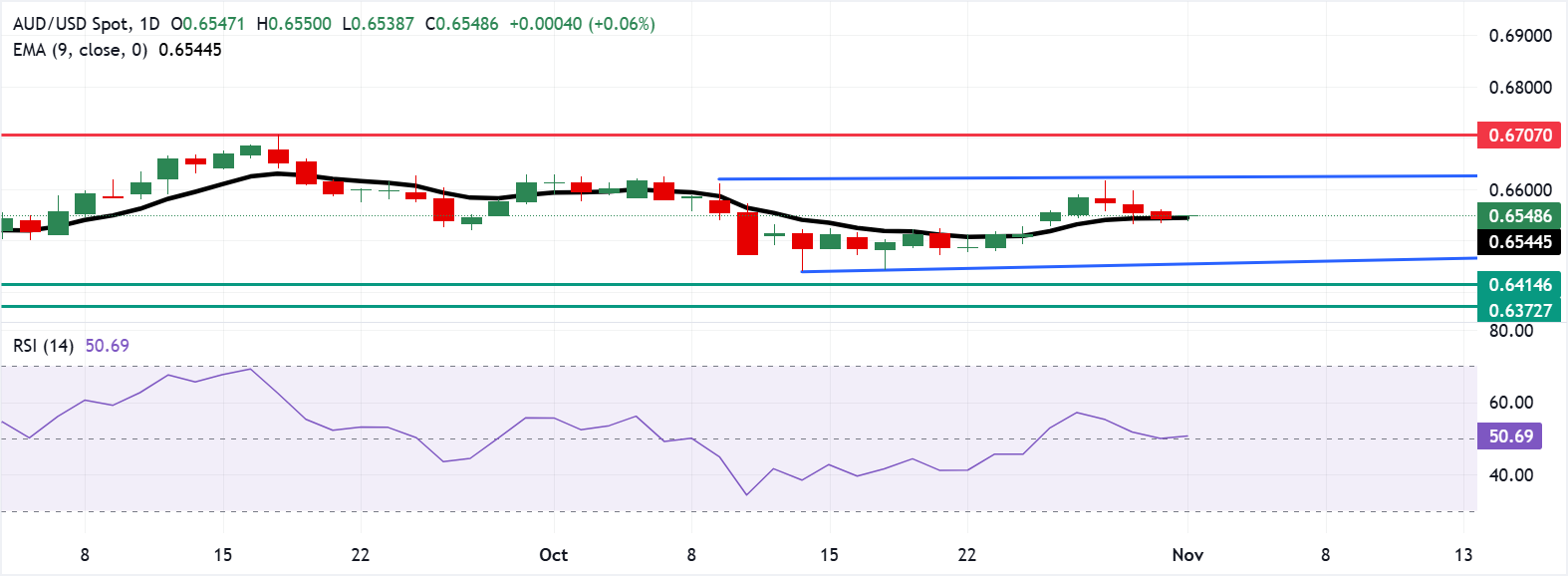 AUD/USD货币对在周一交易于0.6550附近。日缐图的技术分析表明,货币对在矩形模式内横盘整理。然而,该货币对略高于九日指数移动平均缐(EMA),表明短期价格动能较强。