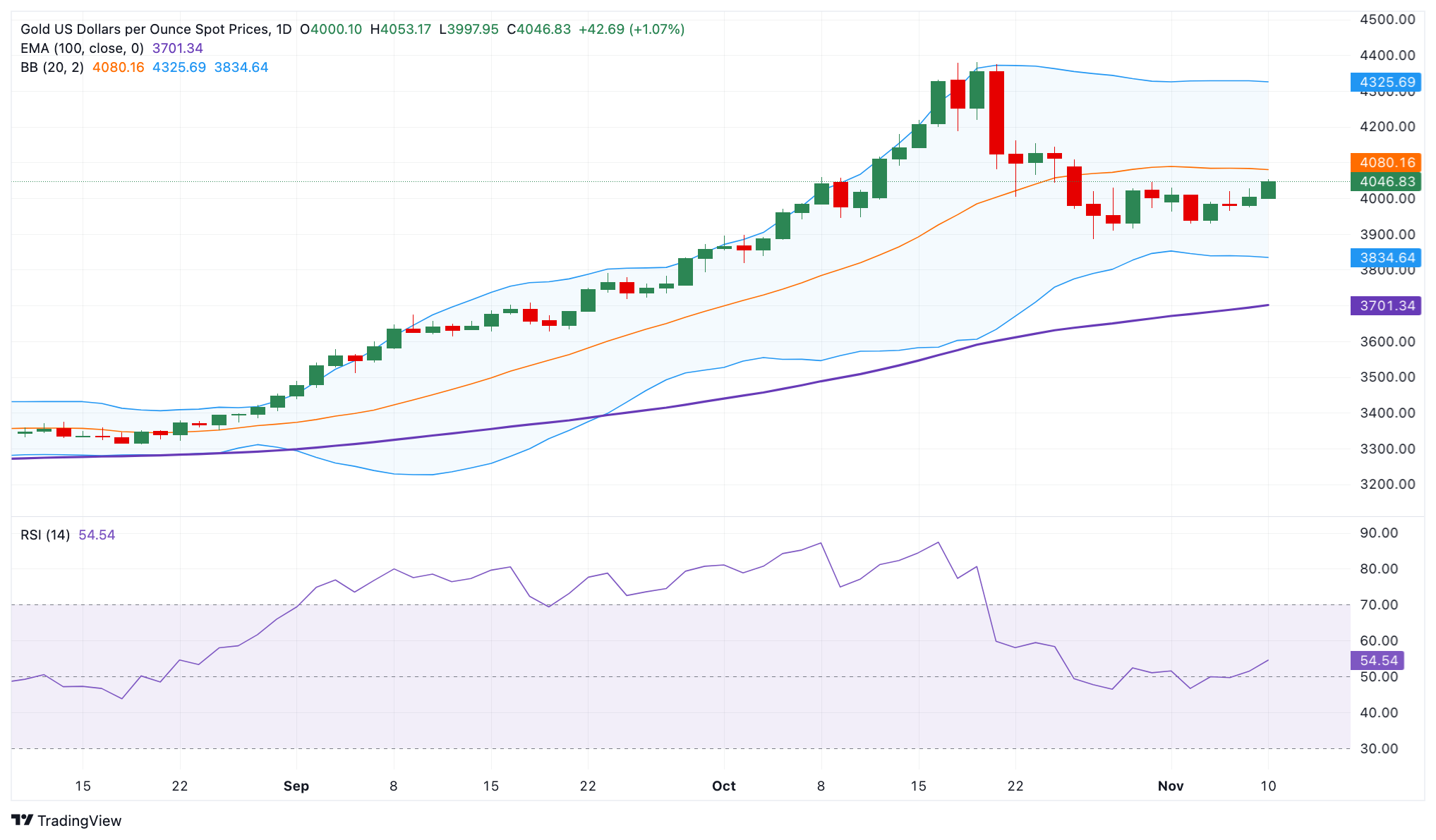 如果我们𫔭始看到看跌蜡烛图和持续交易在4000美元以下,这可能表明卖方重新掌控局面。在这种情况下,黄金/美元可能会回落至布林带的下限3835美元,随后是100日EMA的3705美元。
