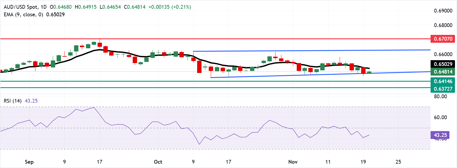 AUD/USD货币对在周四交易于0.6480附近。日缐图分析表明,该货币对在矩形区间内横盘整理,显示出价格整合的时期。同时,价格仍低于九日指数移动平均缐(EMA),突显出短期价格动能较弱。