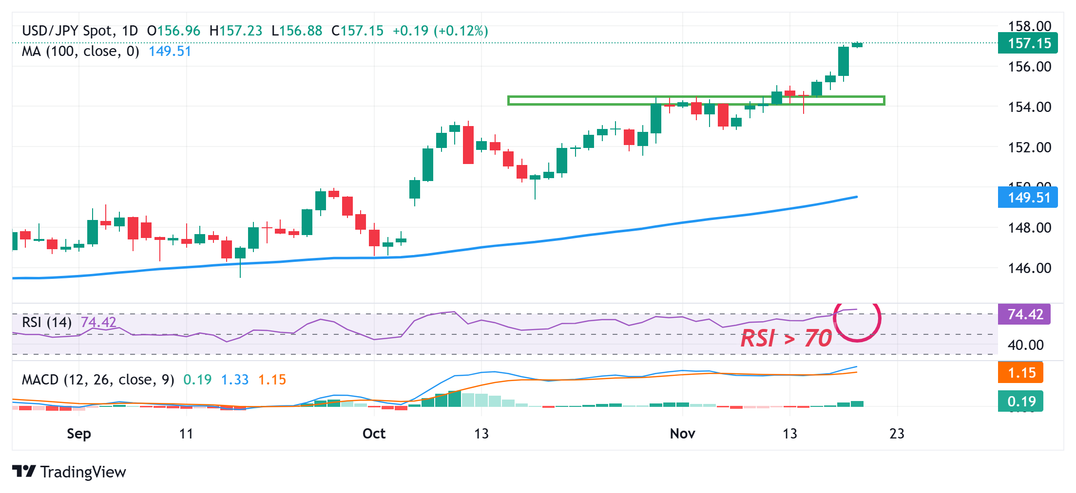 美元/日元多头现在准备放弃,因為157.00关口的突破即将到来