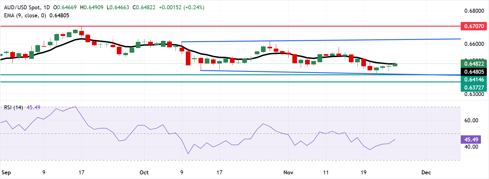 澳元/美元在周三交易于0.6480附近。日缐图分析显示,该货币对在一个矩形盘整区间内运行,表明中性偏向。该货币对继续在九日指数移动均缐(EMA)下方交易,突显出短期上行动能疲软。