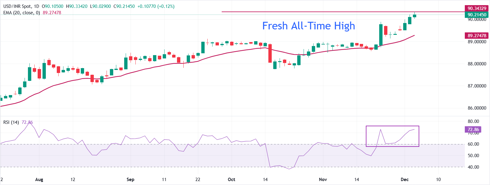技术分析:美元/印度卢比刷新历史新高接近90.30