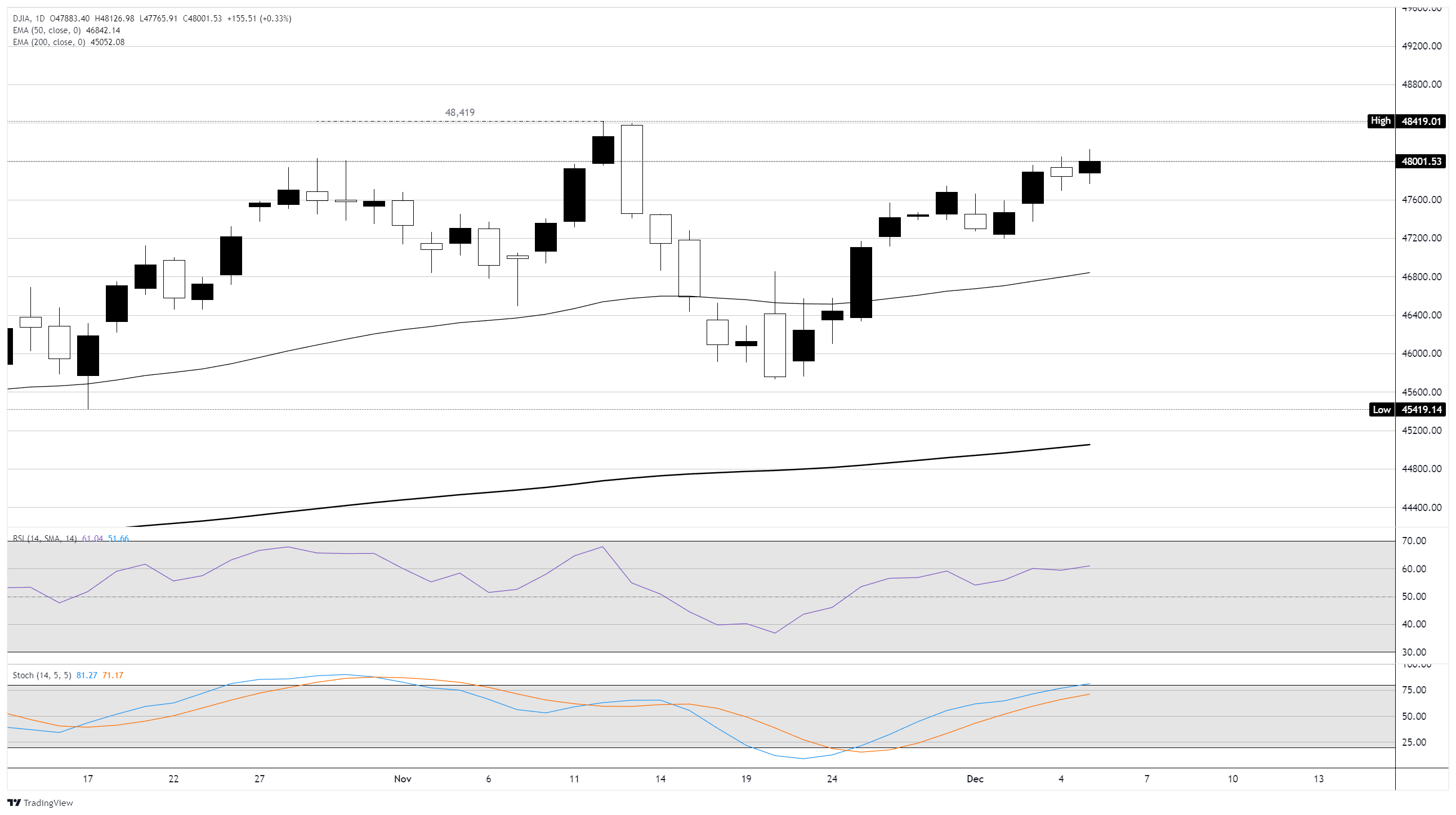 道琼斯工业平均指数(DJIA)周五小幅上涨,再次攀升150点,结束了接近48000关口的温和看涨周。侭管是来自9月份的美国个人消费支出价格指数(PCE)数据,仍然增强了市场对美联储(Fed)将在12月10日进行第三次连续降息的信心。