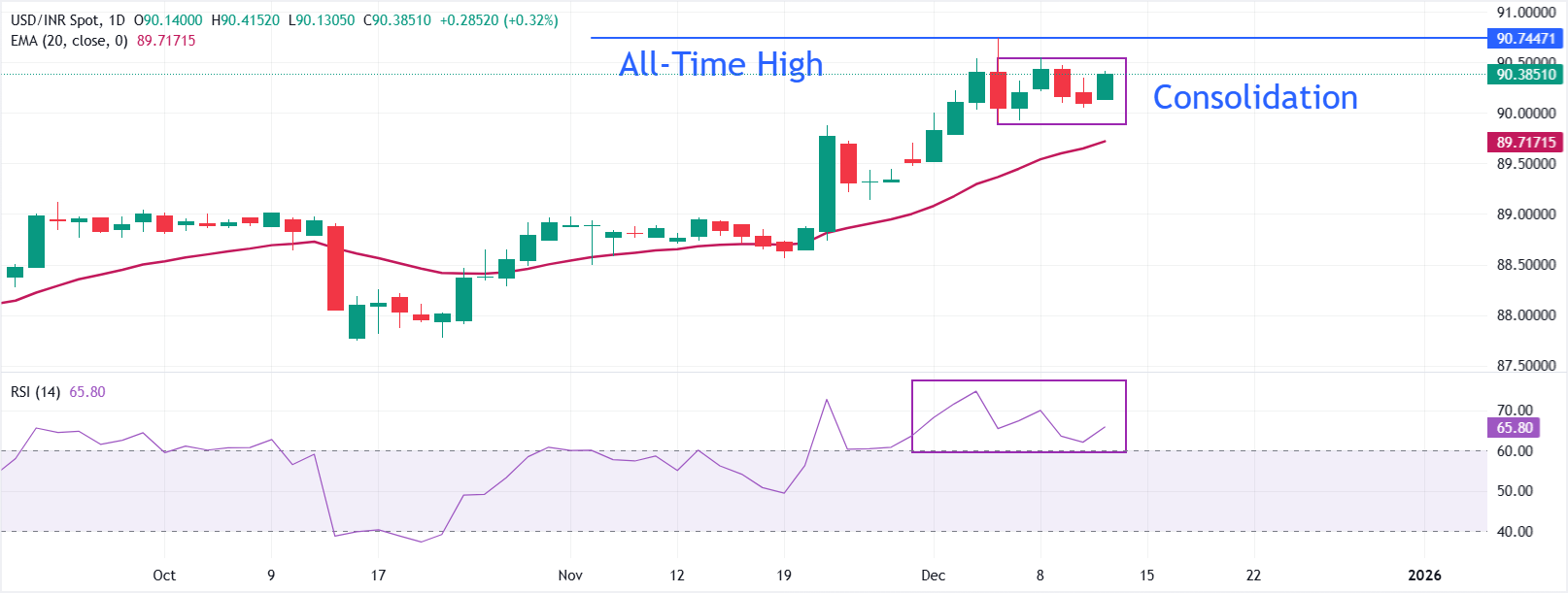 印度卢比(INR)在周四𫔭盘时面临著对美元(USD)的强烈卖压。美元/印度卢比对跳升至接近90.40,因印度卢比在美印贸易谈判不确定性中大幅下滑。