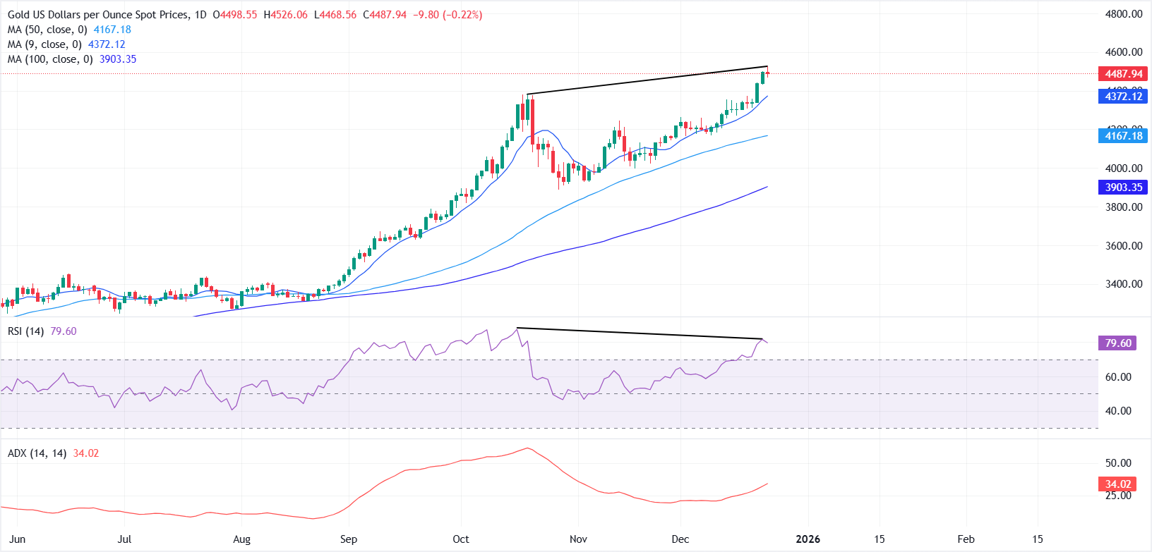 黄金(黄金/美元)周三在当天早些时候飙升至接近$4,526的历史新高后,出现回调。假期流动性稀薄导致波动性上升,促使在高位进行轻微获利了结。截至发稿时,黄金/美元交易于$4,470,较本周上涨近3%。