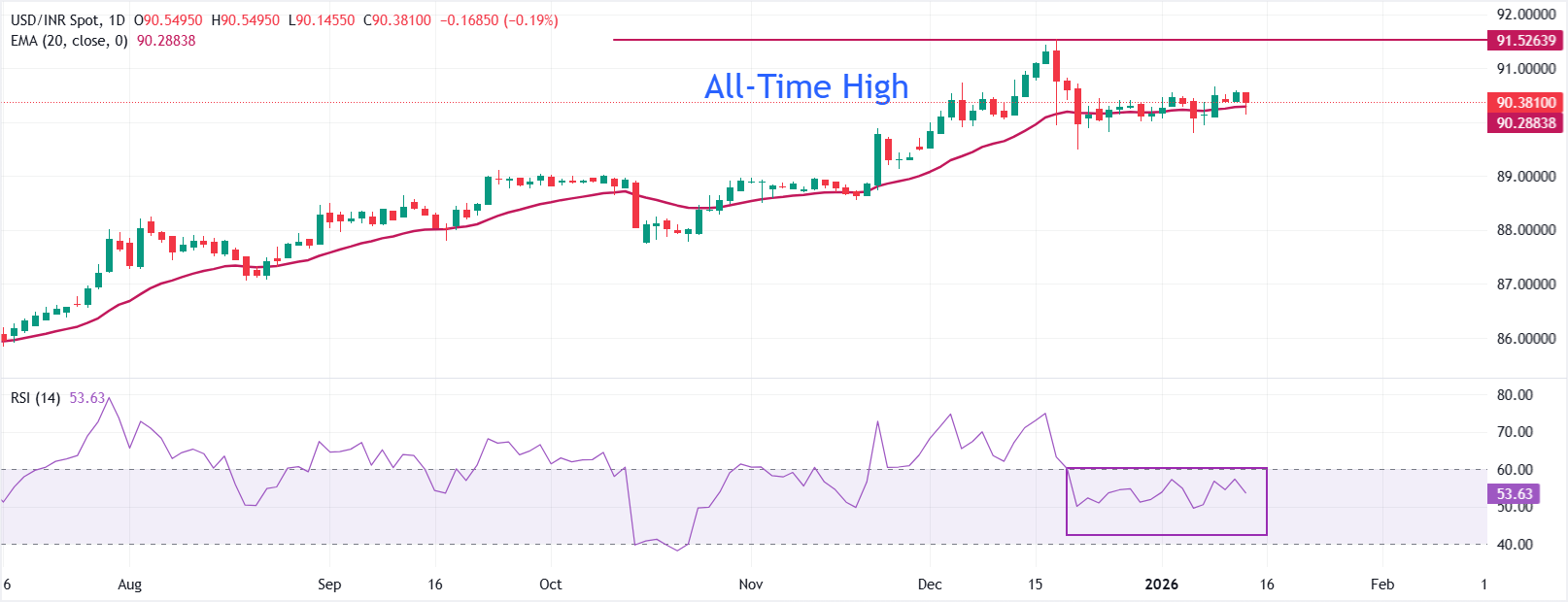 美元/印度卢比(USD/INR)在撰写时交易于90.3810附近。价格保持在90.29的20日指数移动平均缐(EMA)之上,维持短期上行偏向。20日EMA正在上升,支持向上的最小阻力路径。