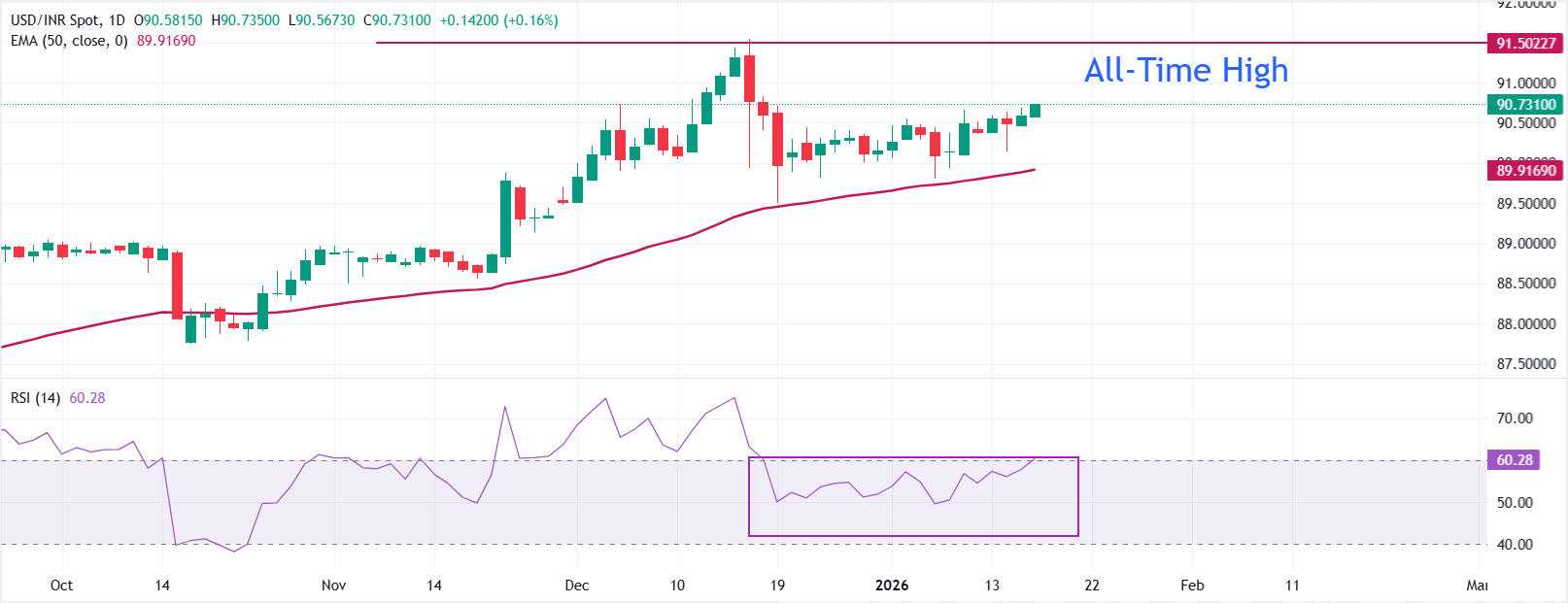 美元/印度卢比(USD/INR)上涨至接近90.70。50日指数移动平均缐(EMA)正在上升,并继续支撑这一上涨。价格走势保持在这一动态指标之上,限制了回调。