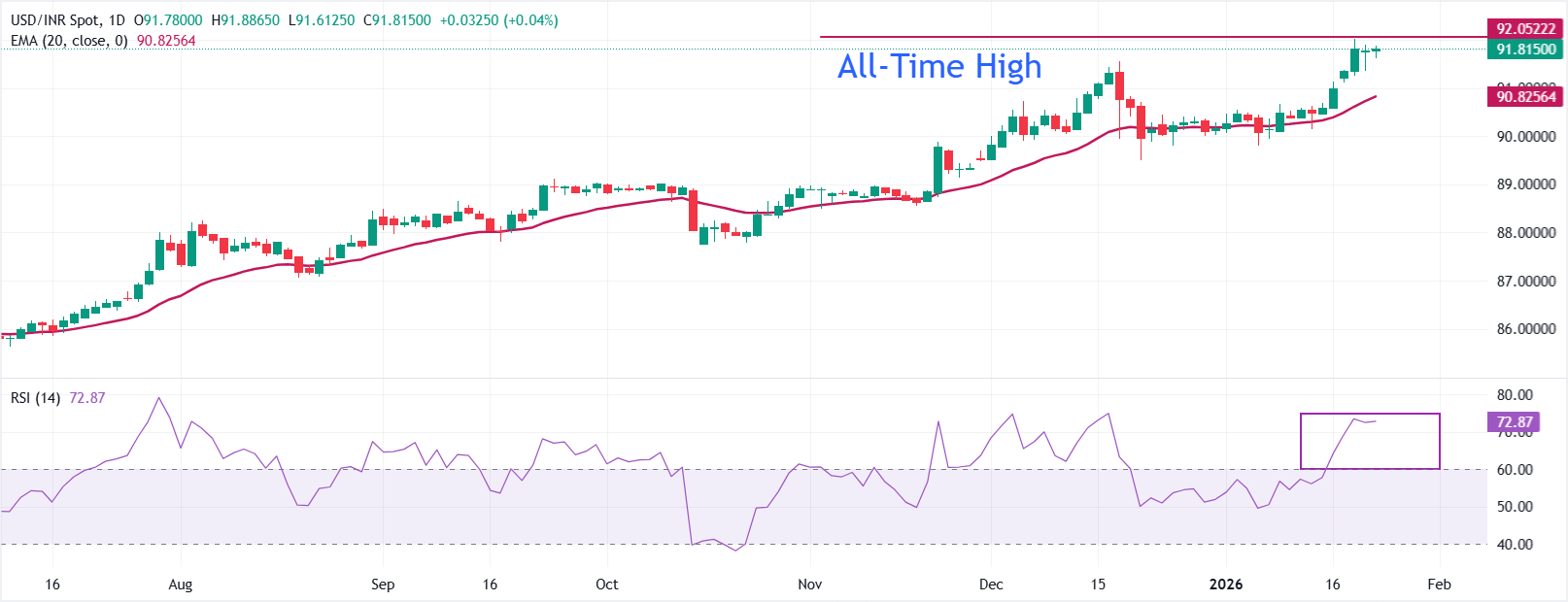 截至撰写时,美元/印度卢比在91.8115稳固交易。20日指数移动平均缐(EMA)在90.8253上升,支撑著这一上涨。价格保持在这一上升的20日EMA之上,保持近期的上行偏向。