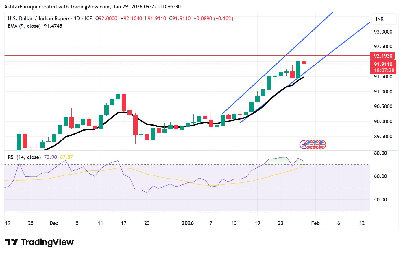 美元/印度卢比在撰写时交易约92.00。日缐图分析显示出持续的看涨偏向,该货币对在上升通道模式中上涨。然而,14天相对强弱指数(RSI)為74.00,表明超𧹒状态,暗示该货币对在短期内可能过度拉伸。这增加了修正回调或整合的风险,即使整体趋势仍然看涨。