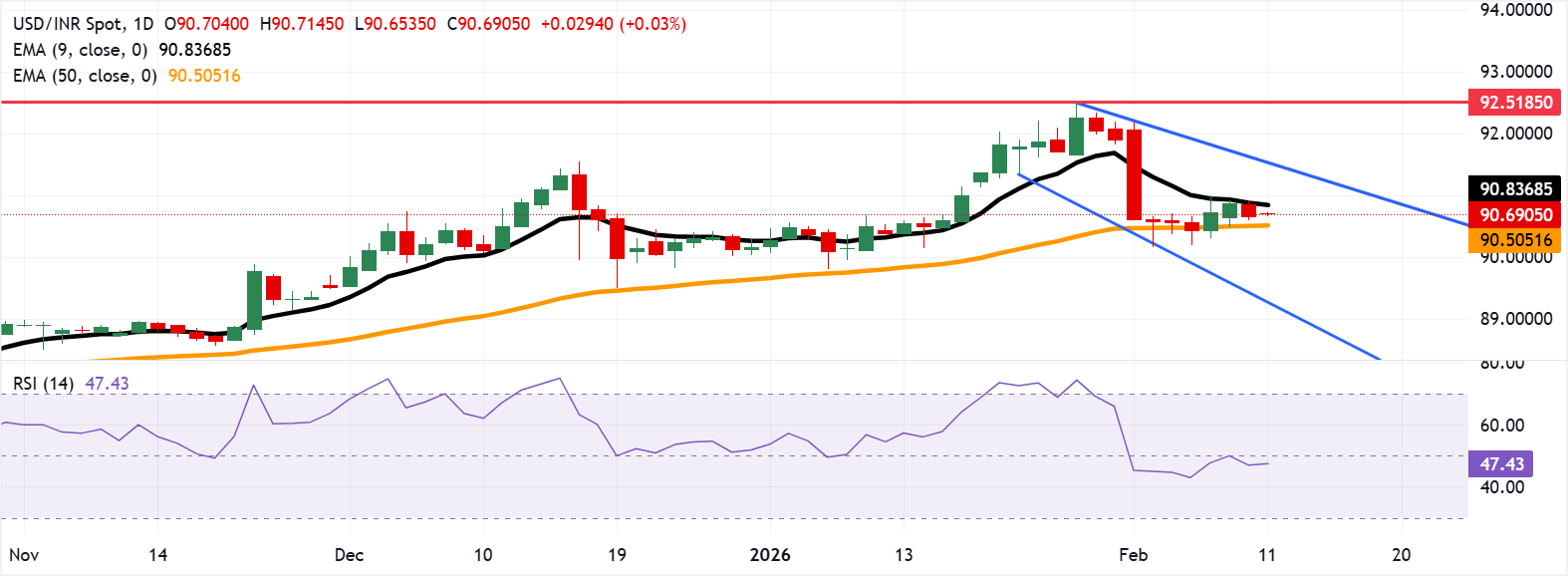 美元/印度卢比在撰写时交易约為90.70。日缐图分析显示出看跌偏向,汇价在下降通道内波动。14天相对强弱指数(RSI)為47,表明中性至看跌的动能,在近期超𧹒条件后有所缓解。