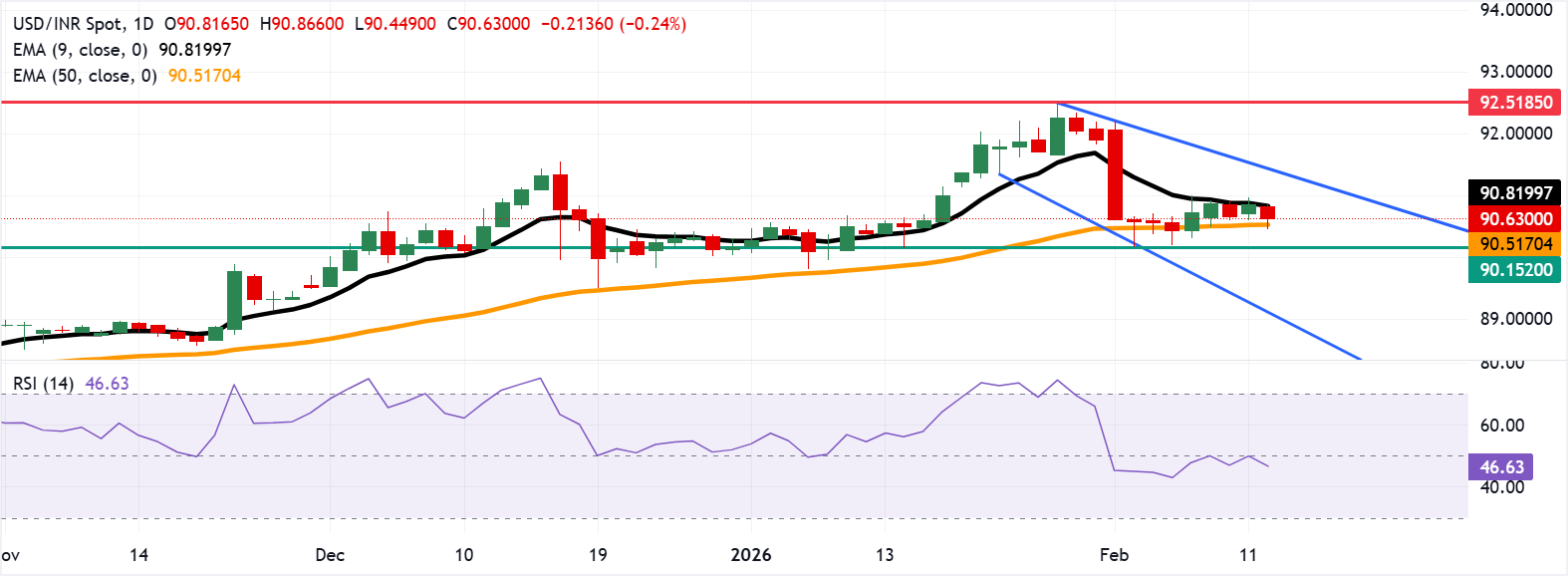 美元/印度卢比在从九日EMA回撤后交易接近90.50