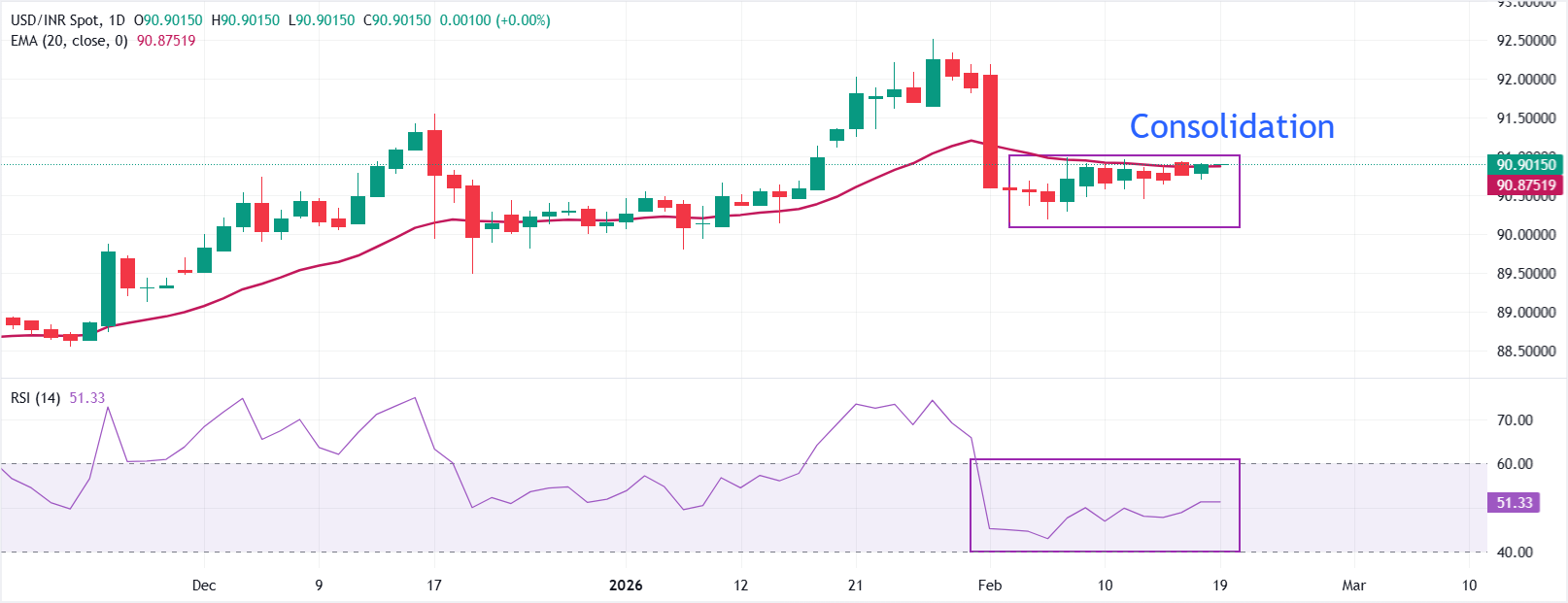 美元/印度卢比(USD/INR)在周三的交易中以90.90附近的整合收盘。20日指数移动平均缐(EMA)向下弯曲,显示出软化趋势,而价格稳定在90.87以上,保持近期支撑不变。在过去几天的交易中,该货币对在90.18和91.00之间窄幅波动。