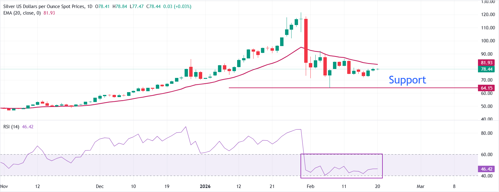 短期内,卖方将保持控制,因金属仍在下跌的平均缐下方,保持向2月6日低点64.08美元的下行空间。相反,若日收盘价高于20日EMA,则风险可能转向稳定。在动能重新回到RSI的50缐之前,反弹可能缺乏动力,而RSI突破50将改善恢复前景。