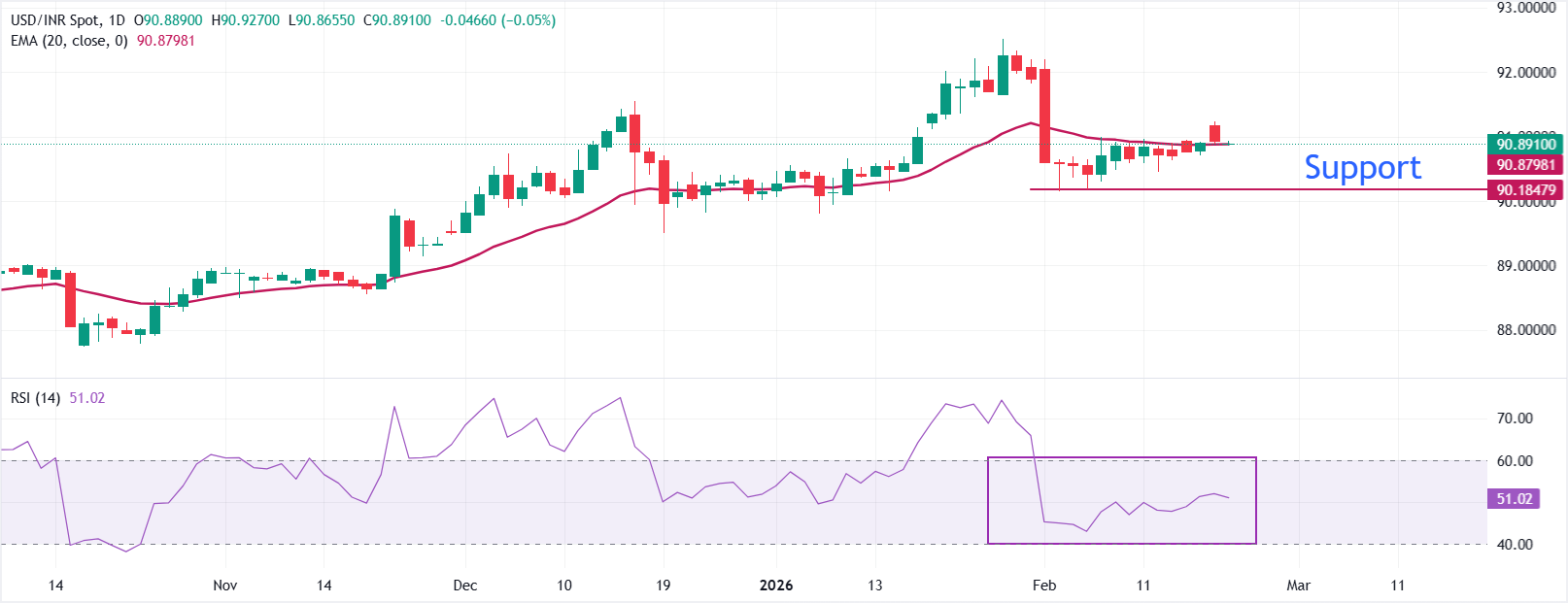 美元/印度卢比在𫔭盘交易中下滑至接近90.85。价格保持在90.888的20日指数移动平均缐(EMA)之上,而该均缐在最近的下行后趋于平坦,发出盘整信号。EMA的轻微上升表明初步支撑在现货下方形成。