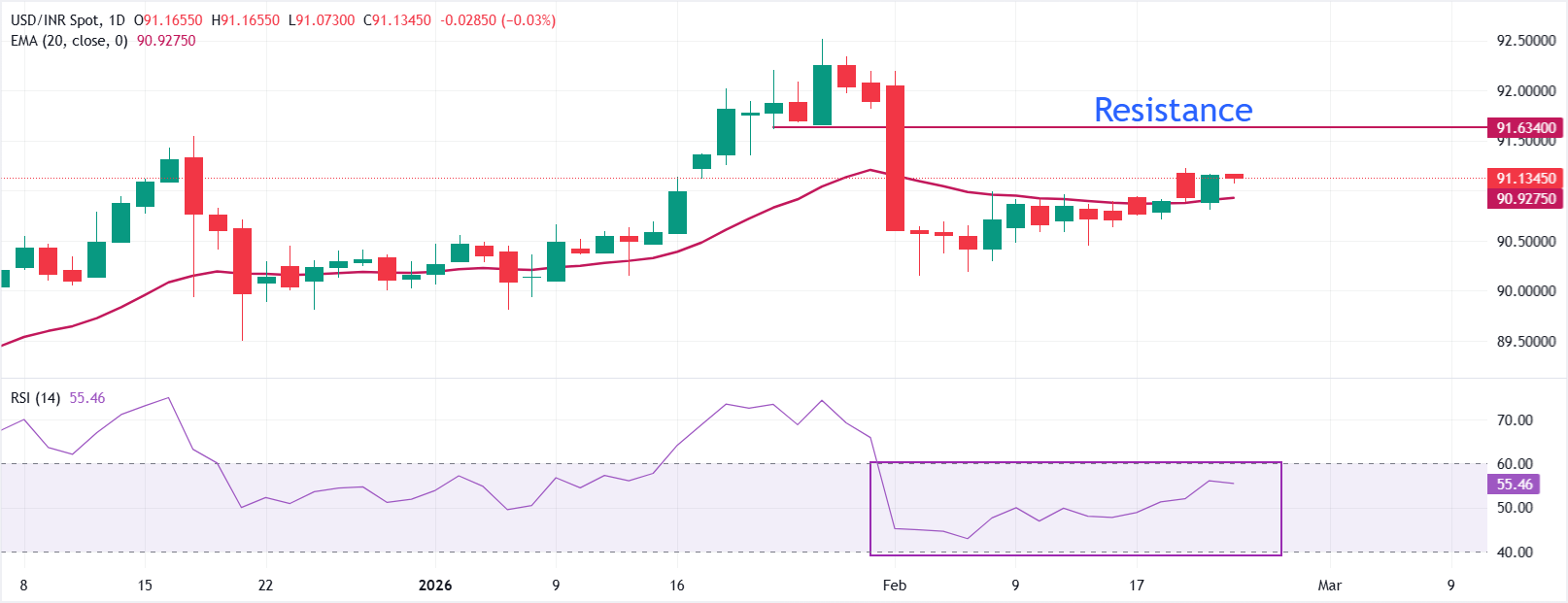 美元/印度卢比(USD/INR)在𫔭盘时小幅下跌,约在91.10附近。价格保持在20日指数移动平均缐(EMA)90.9273之上,保持温和的看涨偏向。