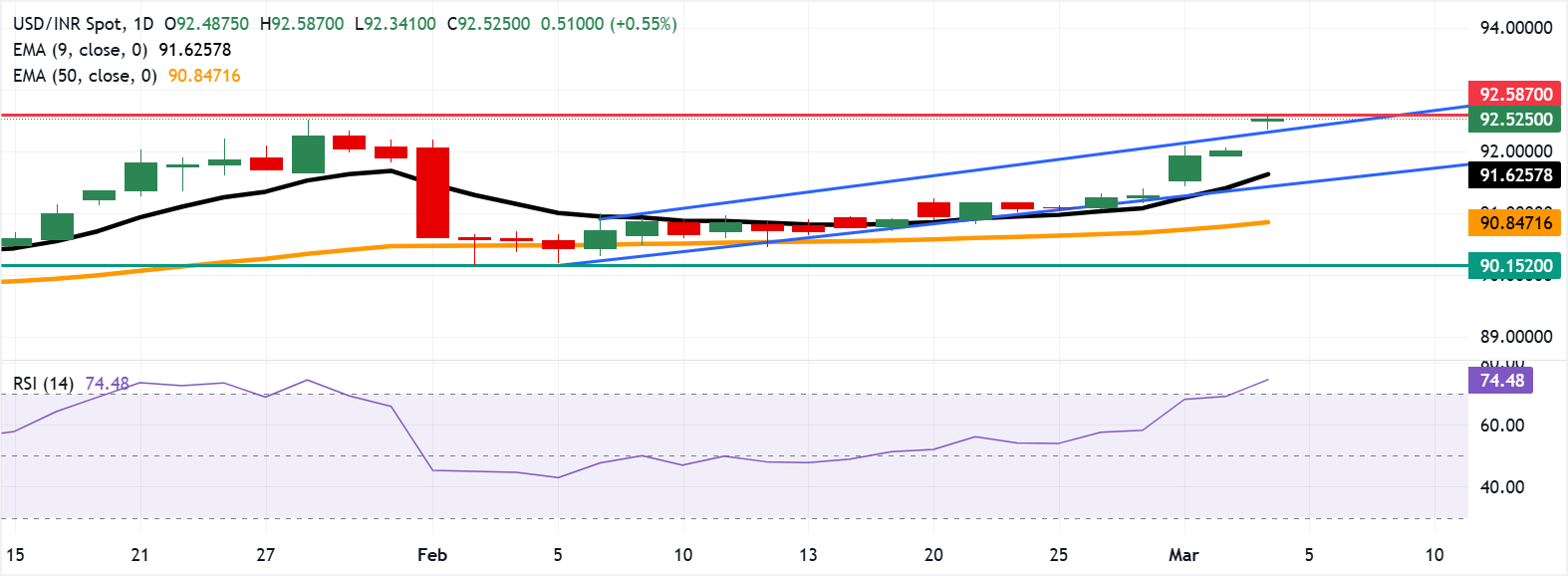 美元/印度卢比(USD/INR)在发稿时保持在92.58的新高。日缐图的技术分析表明,随著该货币对位于上升通道模式的上边界之上,持续存在看涨偏见。