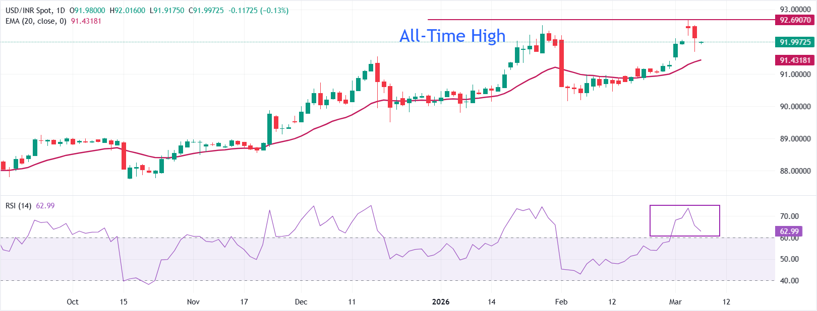 印度卢比(INR)在周五的𫔭盘交易中对美元(USD)走高。美元/印度卢比(USD/INR)跌至接近92.00,因為印度卢比在周四获得了印度储备银行(RBI)在外汇市场干预以应对过度单边波动所提供的支撑。