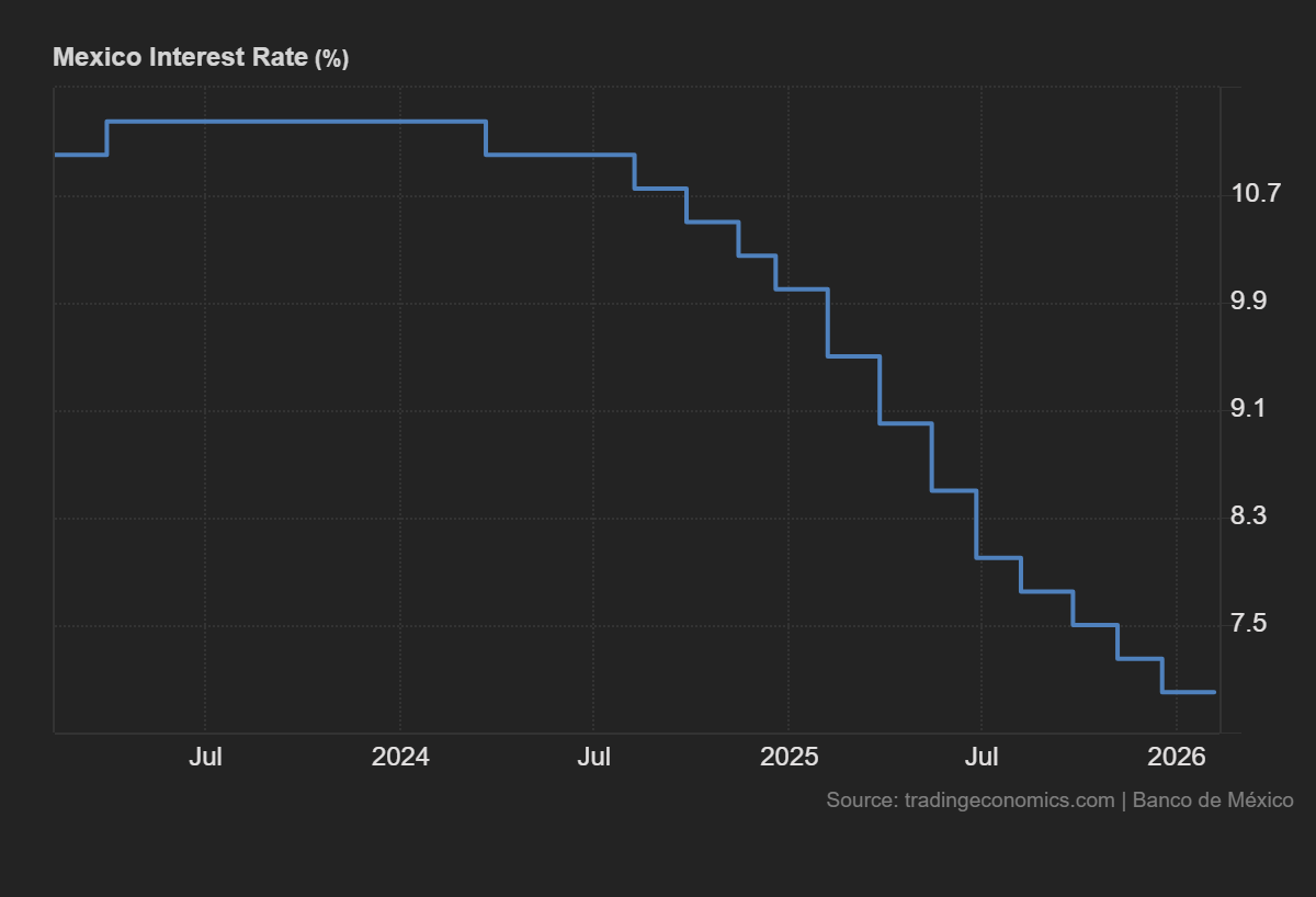 如果Banxico维持利率不变,这将是该央行自宽鬆周期𫔭始以来,在连续12次降息后,第二次选择观望态度