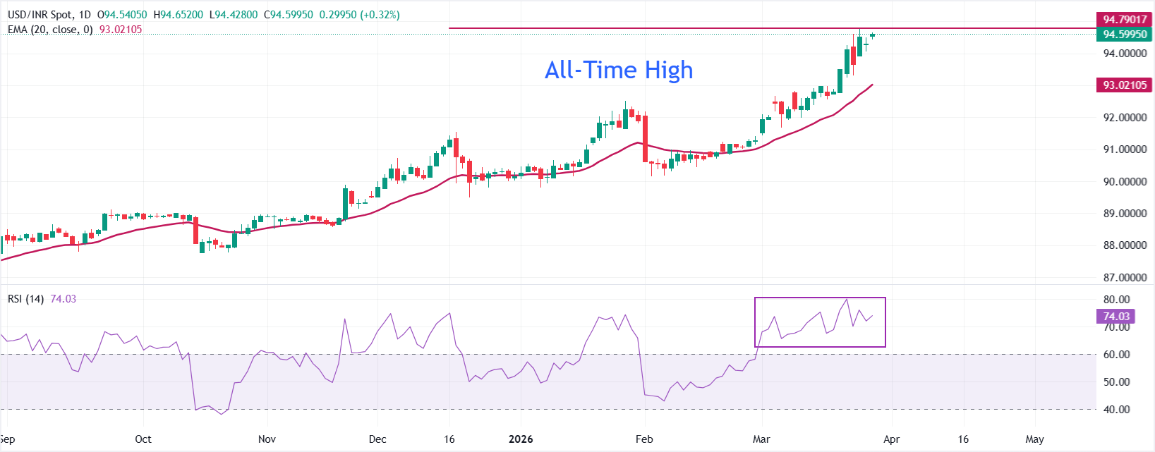 印度卢比(INR)在周五𫔭盘兑美元(USD)走低,此前一天因拉姆纳瓦米节假日休市。美元兑印度卢比汇率升至接近94.60,极其接近历史高点94.75,因市场情绪在美伊為结束中东𢧐争的和平谈判存在混乱的情况下保持谨慎。