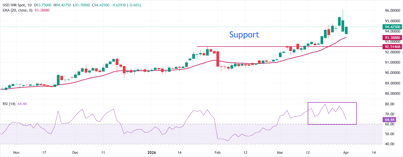 截至发稿,美元兑印度卢比交易于94.50附近。近期连续收高,短期偏向看涨,价格稳守上升的20日指数移动平均缐(EMA),该均缐位于约93.40。